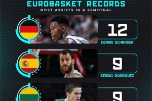 根據(jù)數(shù)據(jù)統(tǒng)計(jì),施羅德此役送出12次助攻,這是歐錦賽半決賽歷史紀(jì)錄。此前的紀(jì)錄保持者是西班牙球員塞爾吉奧-羅德里格斯和立陶宛球員曼塔斯-卡尼提斯,兩人都曾在歐錦賽半決賽上送出9次助攻。