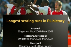 體育資訊9月15日訊 在本輪英超,利物浦1-0擊敗伯恩利,延續(xù)了球隊連續(xù)進球場次紀錄。以下為英超歷史連場破門紀錄榜: