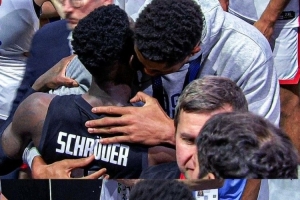 比賽賽后,同時(shí)入選最佳陣容的字母哥和施羅德?lián)肀е乱狻?duì)此,施羅德表示:“揚(yáng)尼斯做出了非常棒的舉動(dòng),他主動(dòng)來找我,說我們各自代表德國(guó)和希臘為國(guó)征戰(zhàn),而他這次也終于為希臘隊(duì)贏得了首枚大賽獎(jiǎng)牌。我對(duì)他只有敬佩——他有四個(gè)可愛的孩子、賢惠的妻子,還有始終陪伴他的兄弟,一家人都在為籃球事業(yè)努力。更不用說他在NBA賽場(chǎng)上的表現(xiàn),那完全是另一個(gè)級(jí)別的存在,絕對(duì)是世界頂尖球員之一。他主動(dòng)過來和我交流,這種舉動(dòng)充滿了體育精神,非常難得。他還說一直在看我們球隊(duì)的YouTube視頻,我覺得這種跨國(guó)家的球員互動(dòng),對(duì)希臘和德國(guó)的籃球交流也很有意義?!?/p>