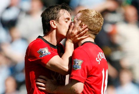 2010年4月,斯科爾斯在曼市德比最后時(shí)刻打入制勝球,幫助曼聯(lián)1-0取勝。進(jìn)球后,他和內(nèi)維爾在場(chǎng)上親吻,震驚全場(chǎng)。