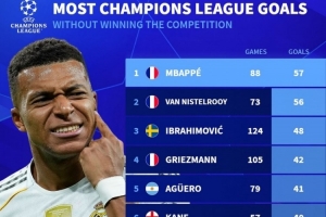 體育資訊9月17日訊 德國轉(zhuǎn)會市場統(tǒng)計(jì)了沒有贏得歐冠球員的歐冠進(jìn)球數(shù)量,并列出榜單,姆巴佩57球居首。