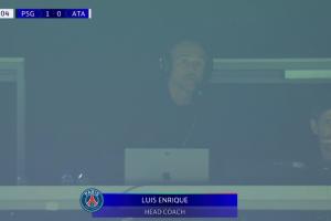 比賽第23分鐘,轉(zhuǎn)播鏡頭給到巴黎主帥恩里克,他出現(xiàn)在看臺上,頭戴耳機指揮著球隊。