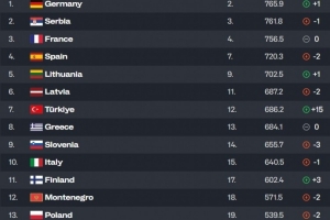 今年歐錦賽的冠亞軍排名均上升,德國(guó)男籃升至第2,力壓塞爾維亞男籃成為歐洲賽區(qū)第一,土耳其男籃狂升15位,來(lái)到第12。