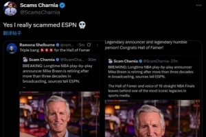 體育資訊9月19日訊 今日,名記Shams的戲仿賬號Scams Charina在推特上進(jìn)行“日常工作”(即發(fā)布假消息),稱ESPN的名人堂解說員邁克-布林將退休。