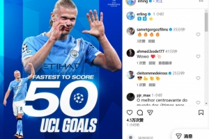 在社交媒體上,哈蘭德曬出了自己最快達(dá)成歐冠50球的海報(bào),顯然這樣的成就令曼城射手非常自豪。