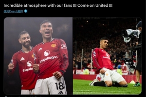 卡塞米羅曬出自己的賽場照,并配文:球迷們營造的氛圍簡直太棒了!??!加油曼聯(lián)?。?!