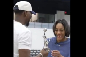 值得一提的是,WNBA總裁凱茜-恩格波特手持獎杯,將其交給了阿德巴約。而阿德巴約也開心地給女友頒發(fā)了獎杯,阿賈流下了激動的淚水。