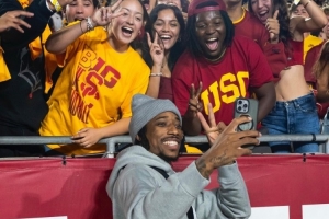 體育資訊9月22日訊 南加大籃球隊社媒更新動態(tài),曬出了校友、NBA球員德羅贊回到母校觀看校橄欖球隊的比賽照片,德羅贊在現(xiàn)場也是熱情的和學弟、學妹們互動。