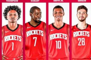 根據(jù)目前的情況來(lái)看,火箭潛在首發(fā)陣容中有阿門(mén)-湯普森、杜蘭特、小賈巴里-史密斯和申京。如果火箭選擇打雙塔(亞當(dāng)斯、卡佩拉),或者堆積側(cè)翼球員的話,那么四年級(jí)生伊森或新援芬尼-史密斯進(jìn)入首發(fā),火箭可以排出好幾套5人都在2米以上的先發(fā)陣容!