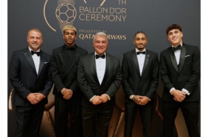 拉波爾塔、弗里克、亞馬爾、拉菲尼亞、庫巴西出席金球獎頒獎典禮,巴薩官方社媒曬出他們的合照,配文:“一個難忘的夜晚?!?/p>
