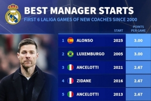 本世紀(jì)皇馬新帥前6場(chǎng)聯(lián)賽場(chǎng)均積分: