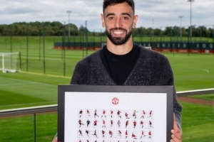 曼聯(lián)官方社媒曬圖,B費(fèi)獲得100球的紀(jì)念品,一個(gè)由100個(gè)B費(fèi)卡通圖案組成的紀(jì)念框。