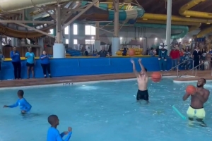 兩人在泳池進(jìn)行投籃PK,為Boys & Girls Club of Greater Houston俱樂部籌集了1萬美元的善款。