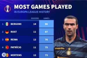 體育資訊9月25日訊 德轉(zhuǎn)統(tǒng)計(jì)了歐聯(lián)(含前身歐洲聯(lián)盟杯)球員出場數(shù)據(jù),貝爾戈米96場成為出場王,雷納、曾加位居前十。