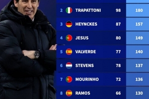 體育資訊9月25日訊 德轉(zhuǎn)盤點了歐聯(lián)杯歷史上主帥贏得積分最多紀錄,其中埃梅里居首,本賽季執(zhí)教維拉的他是否能奪得個人第五座歐聯(lián)杯冠軍值得期待。以下為具體榜單: