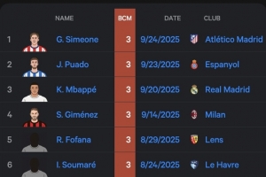 體育資訊9月25日訊 Stat Muse統(tǒng)計了五大聯(lián)賽單場錯失重大機會最多的球員,有六人單場錯失3次重大機會,并列第一。