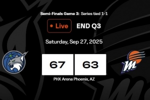 體育資訊9月27日訊 WNBA季后賽半決賽G3(大比分目前1比1),山貓對(duì)陣水星。
