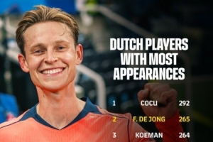 據(jù)巴薩官方數(shù)據(jù)統(tǒng)計,弗蘭基-德容為巴薩出戰(zhàn)場次已經(jīng)達(dá)到265場,超越羅納德-科曼,成為代表巴薩出戰(zhàn)場次第二多的荷蘭球員,僅次于292場的科庫。