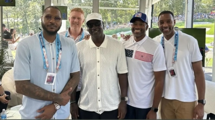 j體育資訊9月29日訊 今日,NBA傳奇球星邁克爾-喬丹、卡梅隆-安東尼、特雷西-麥克格雷迪、文斯-卡特和布萊恩-斯卡拉布賴恩現(xiàn)身貝斯佩奇黑球場,參加萊德杯第三天的比賽!
