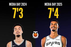 美媒從名單上發(fā)現(xiàn),21歲的文班亞馬長高了1英寸,去年媒體日時他的身高是7英尺3英寸(約2米21),現(xiàn)在是7英尺4英寸(約2米24)。