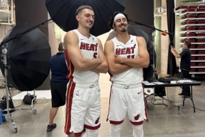 體育資訊9月30日訊 熱火官方社媒曬出了媒體日上約維奇和哈克斯的合影。從照片中可以看到,哈克斯一直踮著腳,想要減少和約維奇的身高劣勢(shì)。