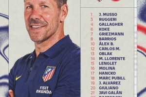 馬競(jìng)大名單:1-穆索、3-魯杰里、4-加拉格爾、6-科克、7-格列茲曼、8-巴里奧斯、10-巴埃納、12-卡洛斯-馬丁、13-奧布拉克、14-馬科斯-略倫特、15-朗格萊、16-莫利納、17-漢茨科、18-普比爾、19-阿爾瓦雷斯、20-朱利亞諾-西蒙尼、21-加蘭、22-拉斯帕多里、23-尼科-岡薩雷斯、24-勒諾爾芒、28-陶菲克、31-埃斯基韋爾
