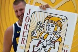 拍攝現(xiàn)場,約基奇先后手拿迷你撲克牌和超大撲克牌,掘金官方配文:新賽季從“小王”進化為“大王”。
