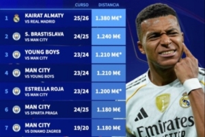 體育資訊9月30日訊 歐冠聯(lián)賽階段第2輪,皇馬將做客對陣阿拉木圖凱拉特?!稗D(zhuǎn)會市場網(wǎng)”統(tǒng)計了歐冠單場對決雙方身價差距最懸殊的10場比賽,除皇馬對陣阿拉木圖凱拉特的比賽排名第一之外,該榜單上其余9組對決全部由曼城及其對手創(chuàng)造。