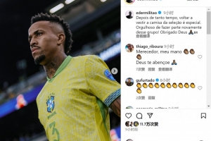 米利唐上次為巴西隊出戰(zhàn)要追溯到去年7月份,此后他因傷病長期缺席,米利唐更新社媒動態(tài),表達了入選巴西隊名單的喜悅之情。
