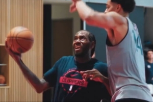 保羅、萊昂納德、哈登、祖巴茨和比爾合體進行隊內訓練,萊昂納德迎著防守強硬上籃打進。