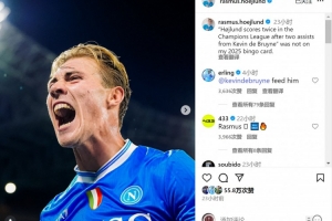 霍伊倫社媒曬出比賽照片,并寫道:“霍伊倫在歐冠比賽中梅開二度,還都是德布勞內(nèi)的助攻——這完全不在我2025年的劇本之中。”