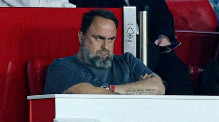 看臺上,諾丁漢森林老板、希臘船王馬里納基斯十分郁悶,死亡凝視+抱頭怒目,看著場上的比賽。