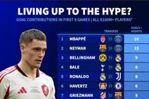 德轉(zhuǎn)“惡趣味”地統(tǒng)計(jì)了轉(zhuǎn)會(huì)費(fèi)上億歐元的攻擊手們?yōu)樾虑蜿?duì)出戰(zhàn)前8場(chǎng)比賽,在進(jìn)球+助攻上的貢獻(xiàn)榜單。姆巴佩、內(nèi)馬爾、貝林厄姆分列前3,而最后一名可謂是為了這碟醋才包的這盤餃子...