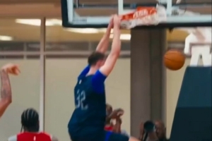 訓(xùn)練當(dāng)中,濃眉持球背轉(zhuǎn)身遭遇兩人包夾,與弗拉格打出精妙高低位配合,后者得球暴扣終結(jié)。
