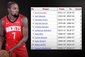 杜蘭特在休斯敦對(duì)陣火箭季后賽?共砍下7次?30+,為歷史最多(共7場(chǎng))。