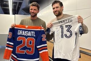 穆勒與德國冰球選手德賴塞特爾交換球衣并合影,后者效力于NHL埃德蒙頓油人隊,也是司職前鋒,兩人社媒轉(zhuǎn)發(fā)合照,并互稱對方為傳奇。