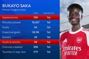 體育資訊10月4日訊 薩卡將迎來(lái)英超出戰(zhàn)200場(chǎng)里程碑,天空體育統(tǒng)計(jì)了薩卡首秀以來(lái)的英超數(shù)據(jù),他的出場(chǎng)次數(shù)、進(jìn)球、助攻等多項(xiàng)數(shù)據(jù)阿森納隊(duì)內(nèi)同期居首。