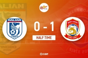傷停補(bǔ)時(shí)4分鐘。上半場比賽結(jié)束,大連英博0-1青島西海岸。