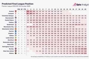 此役過后,數(shù)據(jù)機構(gòu)OPTA超級計算機預(yù)測本賽季英超冠軍↓