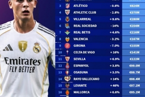 體育資訊10月5日訊 德轉(zhuǎn)此前更新了西甲球員身價,并盤點了目前西甲球隊身價榜,具體如下: