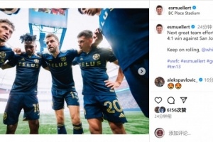 穆勒社媒曬出與隊友的合照,配文:“又一場出色的團(tuán)隊表現(xiàn),4-1擊敗圣何塞。繼續(xù)前進(jìn),溫哥華白浪!”