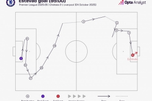 據(jù)Opta統(tǒng)計(jì),10名切爾西球員(埃斯特旺被計(jì)算在內(nèi))參與埃斯特旺的進(jìn)球,整個過程僅用28秒。