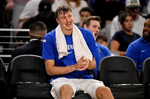 狀元弗拉格只打了上半場,出戰(zhàn)14分鐘,投籃6中3,三分球3中2,罰球2中2,拿到10分6籃板3助攻1蓋帽的數(shù)據(jù),正負(fù)值+8。