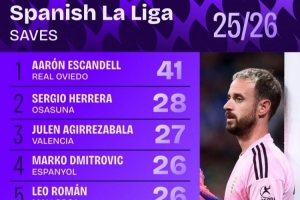 體育資訊10月7日訊 日前,Squawka統(tǒng)計(jì)了本賽季西甲撲救次數(shù)排行,皇家?jiàn)W維耶多門(mén)將埃斯坎德?tīng)栆?1次撲救居首。