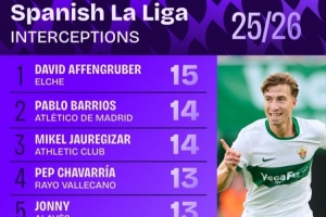 西甲攔截次數(shù)排行:巴里奧斯14次并列第2 瓊阿梅尼12次并列第6
