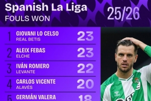 體育資訊10月7日訊 日前,Squawka統(tǒng)計(jì)了本賽季西甲被犯規(guī)次數(shù)排行,洛塞爾索23次居首,朱利亞諾-西蒙尼18次并列第五。