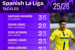 西甲解圍次數(shù)排行:黃潛后衛(wèi)S-穆里尼奧居首 塞爾吉奧-戈麥斯第二