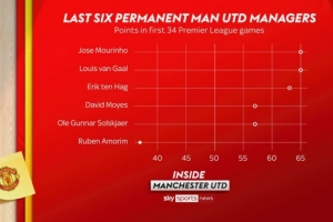 體育資訊10月9日訊 加盟曼聯(lián)以來,阿莫林已經(jīng)率隊踢了34場英超比賽,但他的執(zhí)教表現(xiàn)遠遠沒能達到外界的期望。根據(jù)天空體育的數(shù)據(jù)統(tǒng)計,阿莫林前34場英超比賽僅僅拿到37分,低于之前數(shù)位曼聯(lián)主帥所拿到的積分。