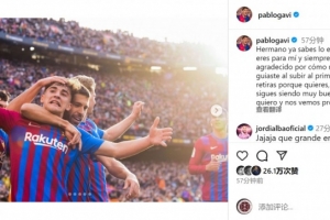 體育資訊10月9日訊 阿爾巴宣布將在本賽季結(jié)束后退役,巴薩中場(chǎng)加維社媒發(fā)文致敬。