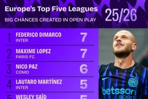 五大聯(lián)賽運動戰(zhàn)創(chuàng)造重大機會榜:迪馬爾科7次居首,帕斯6次